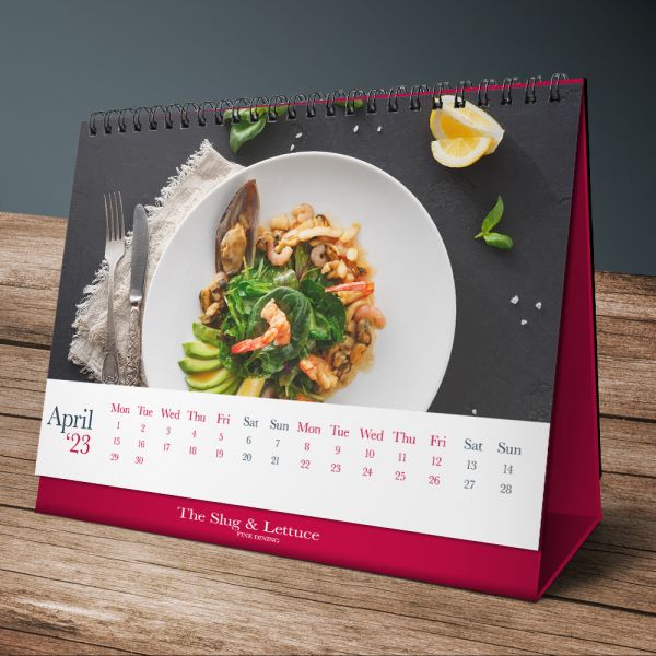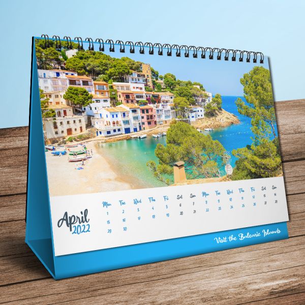 Desk calendars are landscape or portrait in orientation. They are wiro bound at the top, allowing you to flip between different months quickly and easily. Additionally, your calendar is printed in the paper type of your choice: either silk, gloss or uncoated paper. Get an instant desk calendar quote today!