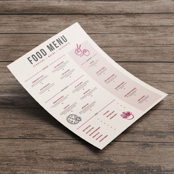 Your menu is one of the most important printed materials that your restaurant, café, food truck, bar, or dining establishment can hand out. It includes all your offerings and gives customers important insights as to what kind of eatery you are. A folded leaflet menu also shows off your brand style and by choosing the right colours, font, and imagery, you can make an impression on your customers. However you decide to style your menu, our menu printing services can provide you with high-quality materials that wow your customers. Choose from different paper sizes, weights, and types and opt for lamination to make your menus sturdier.