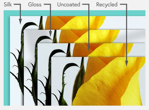 Silk is our recommended default choice for the very best results. It’s a coated paper with a satin finish and a slight sheen. Silk is suitable for print jobs containing text and pictures, makes printed colours appear bright and well defined, and is great for readability. If in doubt, choose silk.